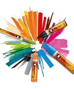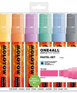 Details: The Molotow ONE4ALL Acrylic Paint Marker Set is high-covering, premium acrylic-based pigment paint in easy-to-handle markers that work on almost every surface, both indoors and outdoors. The flowmaster pump marker system has patented capillary technology and is refillable. This acrylic-based hybrid paint is UV and weather-resistant for highest opacity. It is solvent-free and dilutable with water or acetone and the marker tips are exchangeable. Colors include: Vanilla Pastel, Peach Pastel, Lilac Pastel, Lago Blue Pastel, Ceramic Light Pastel, and Cool Grey Pastel. Made in Germany.